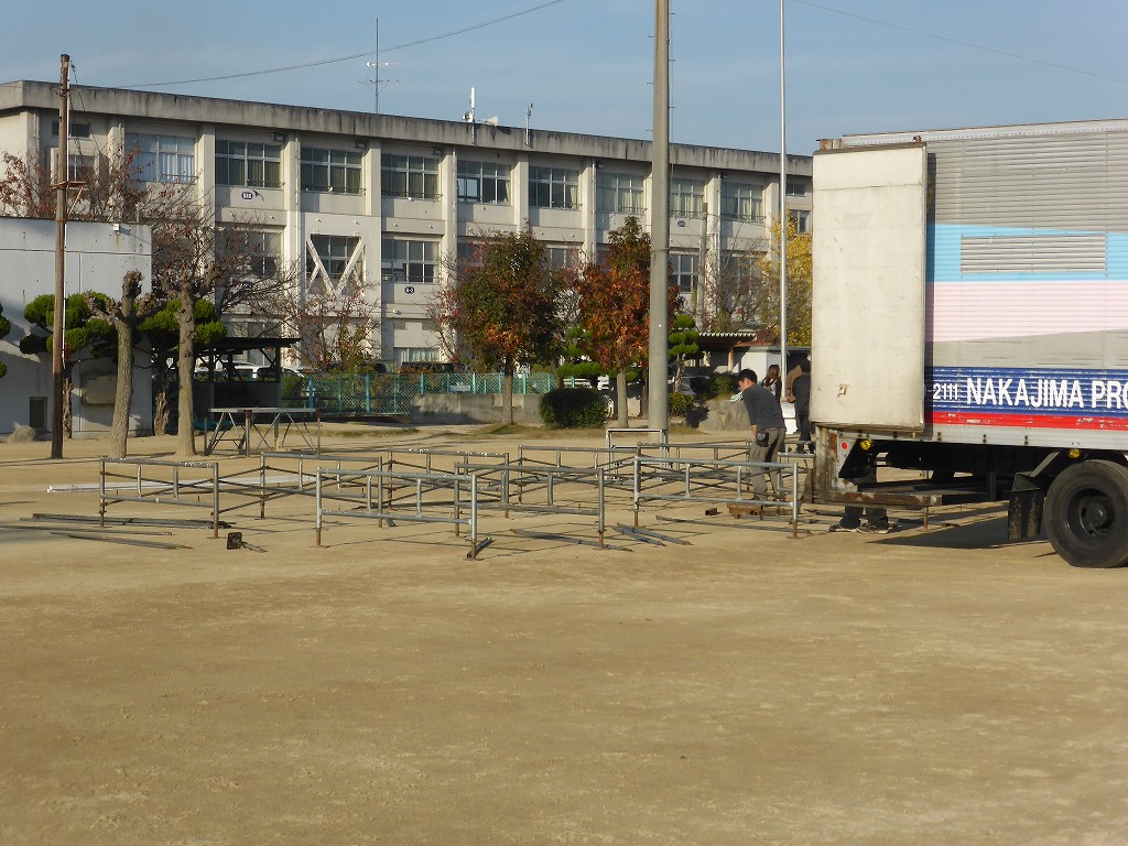 ステージやテントを積んだトラックが到着