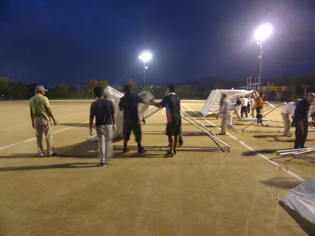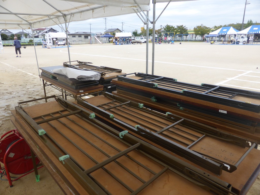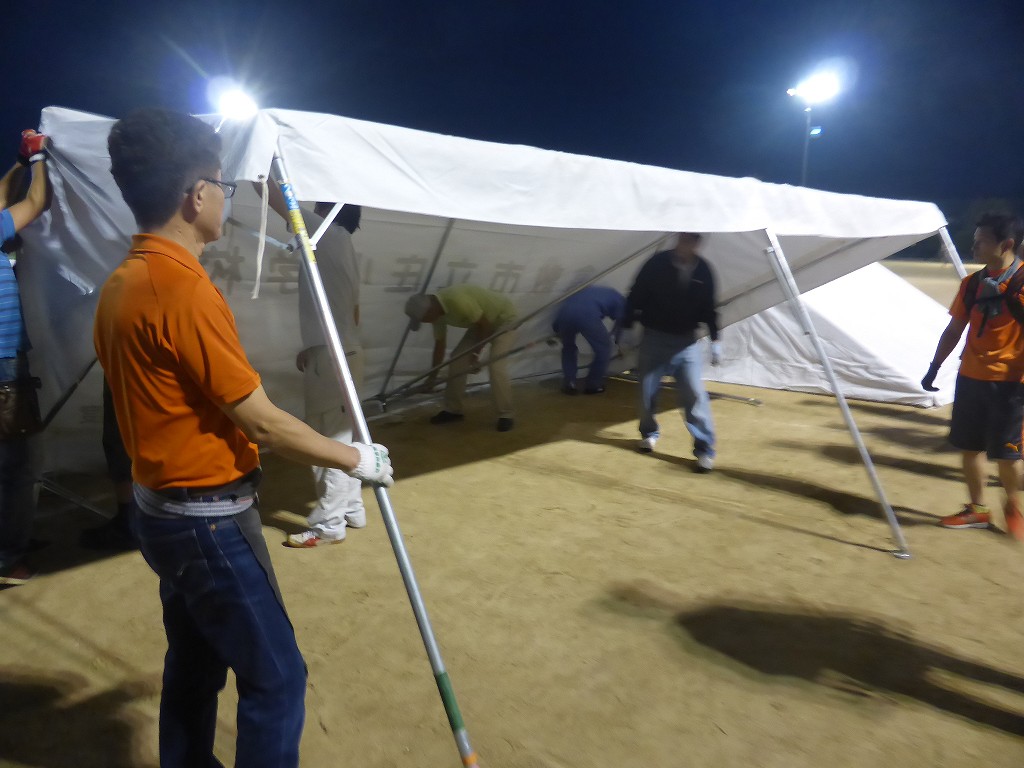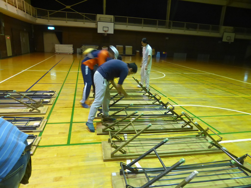 テントを立ち上げ、体育館に準備していた机や椅子の搬入
