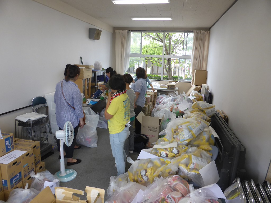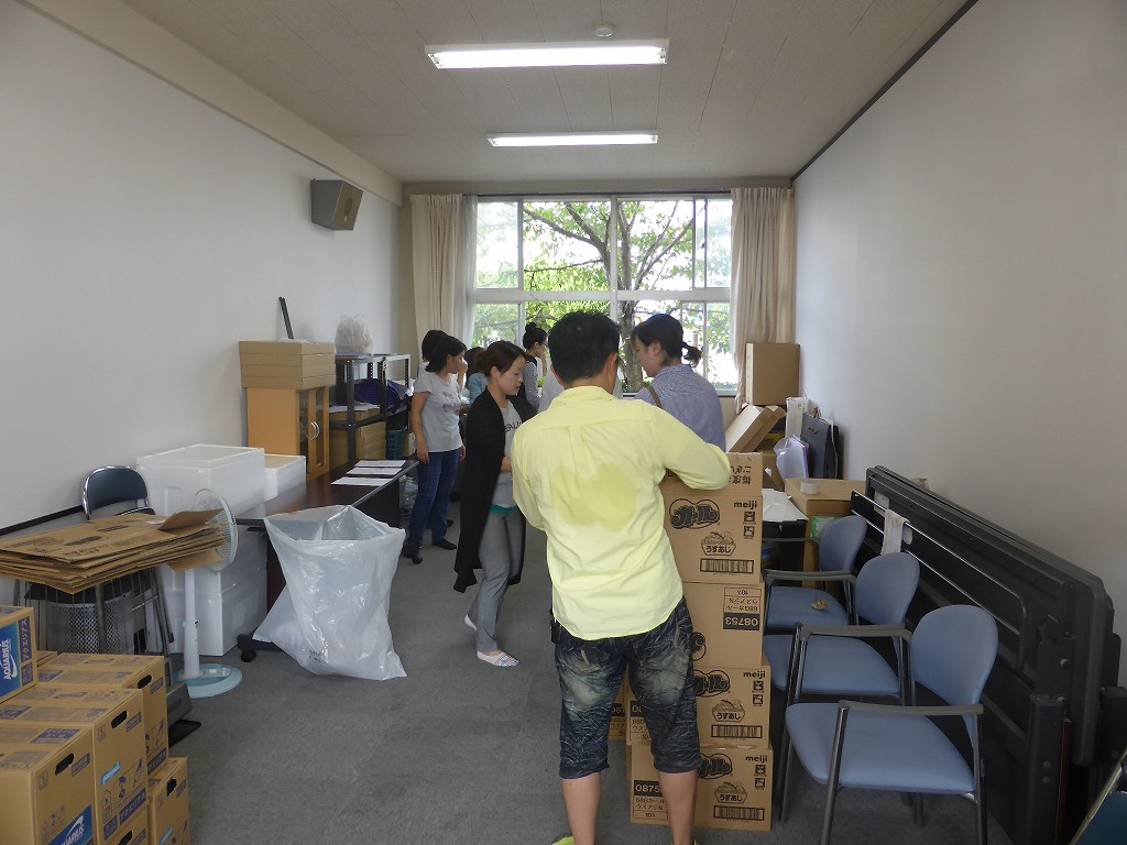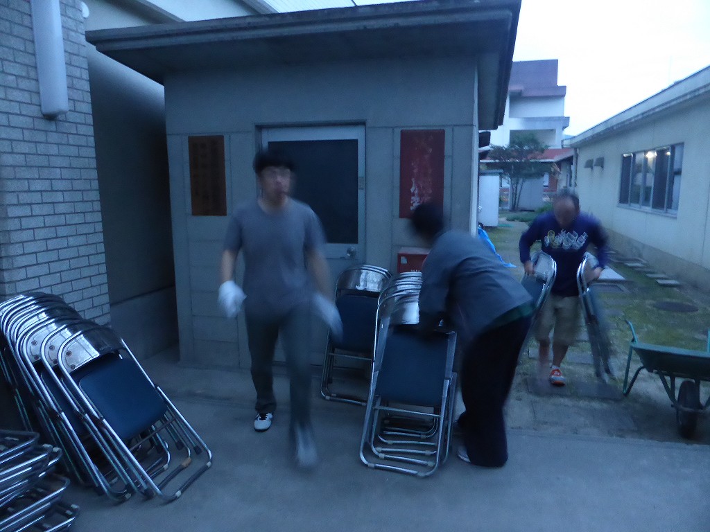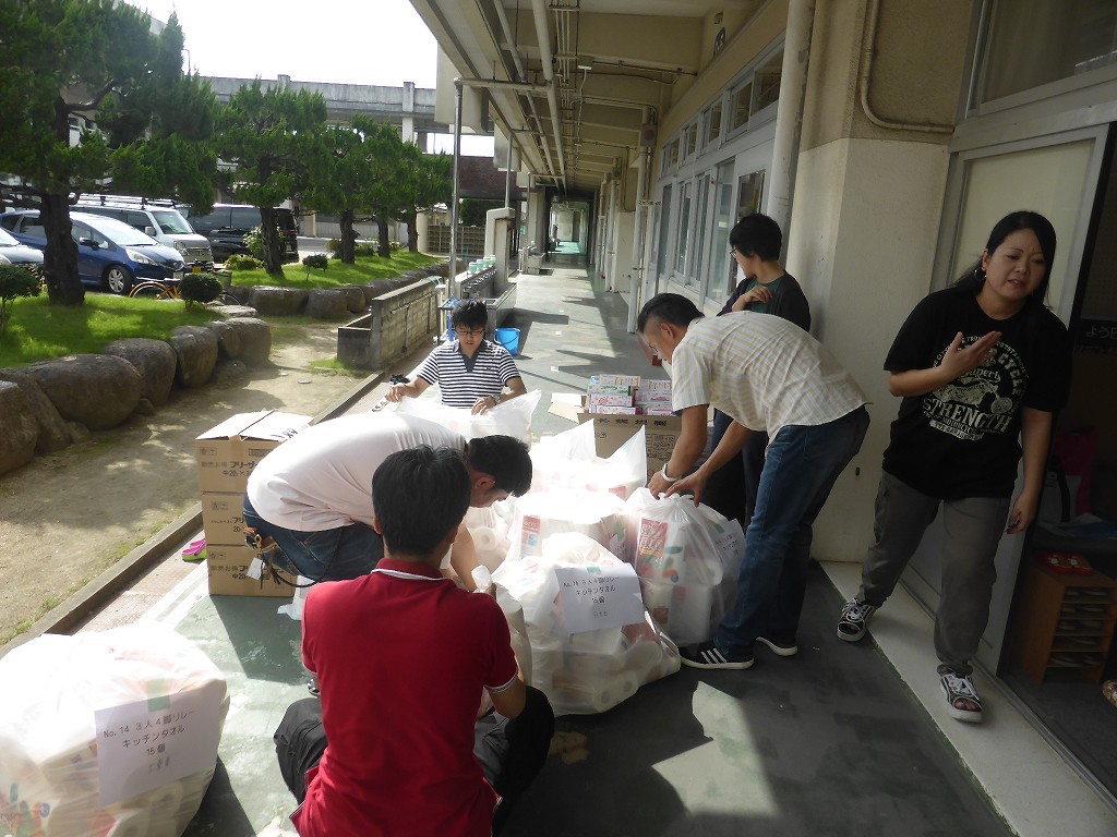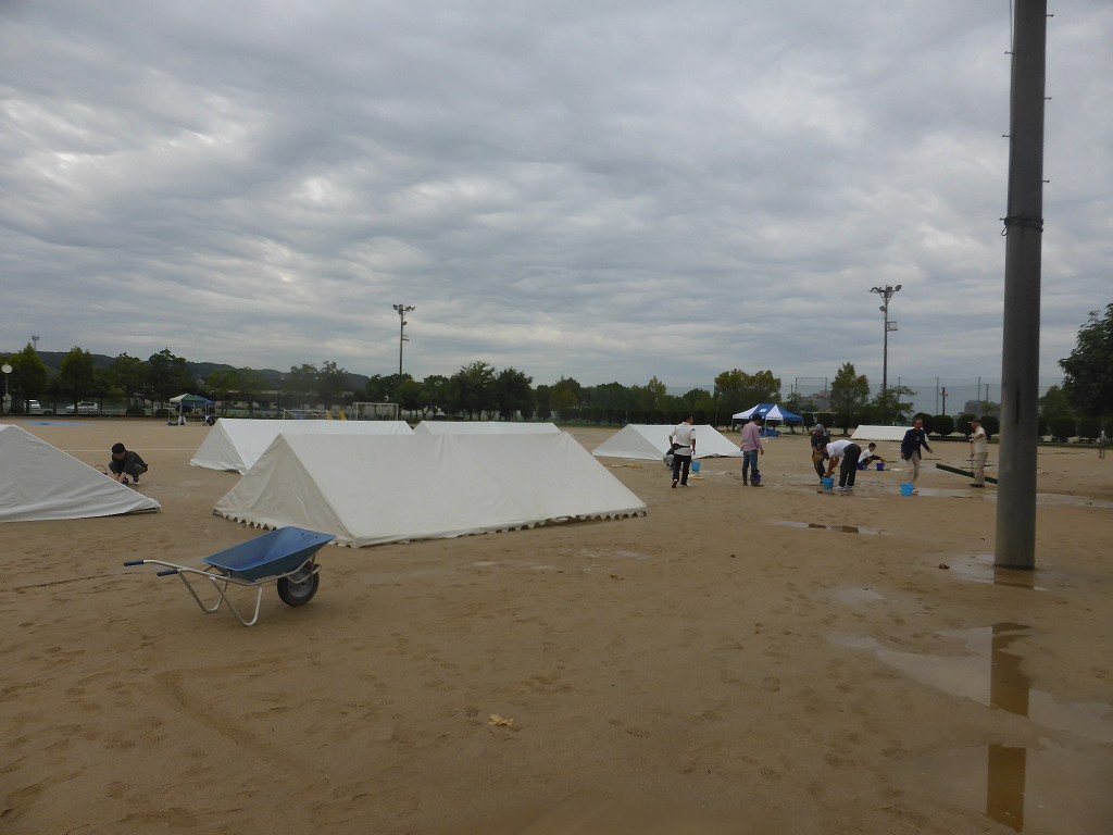 テントを立ち上げ、体育館に準備していた机や椅子の搬入