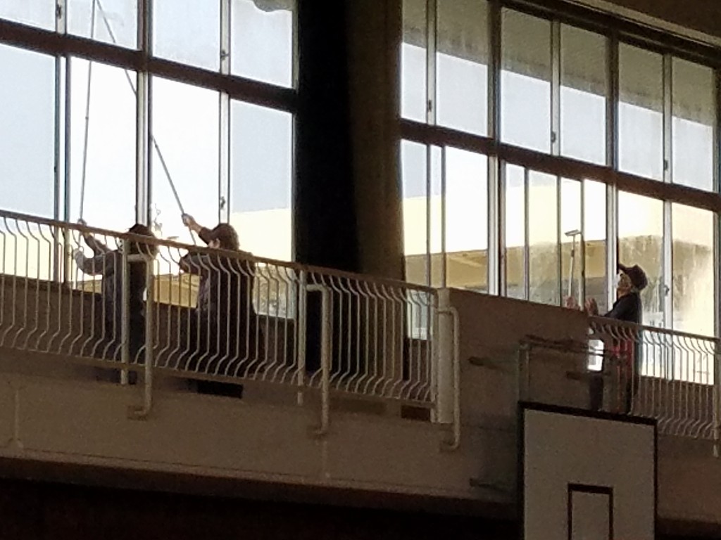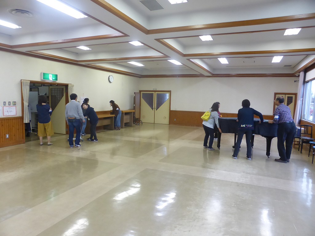 ステージ裏に幕を張り、看板を取り付け、ステージ設営・・・