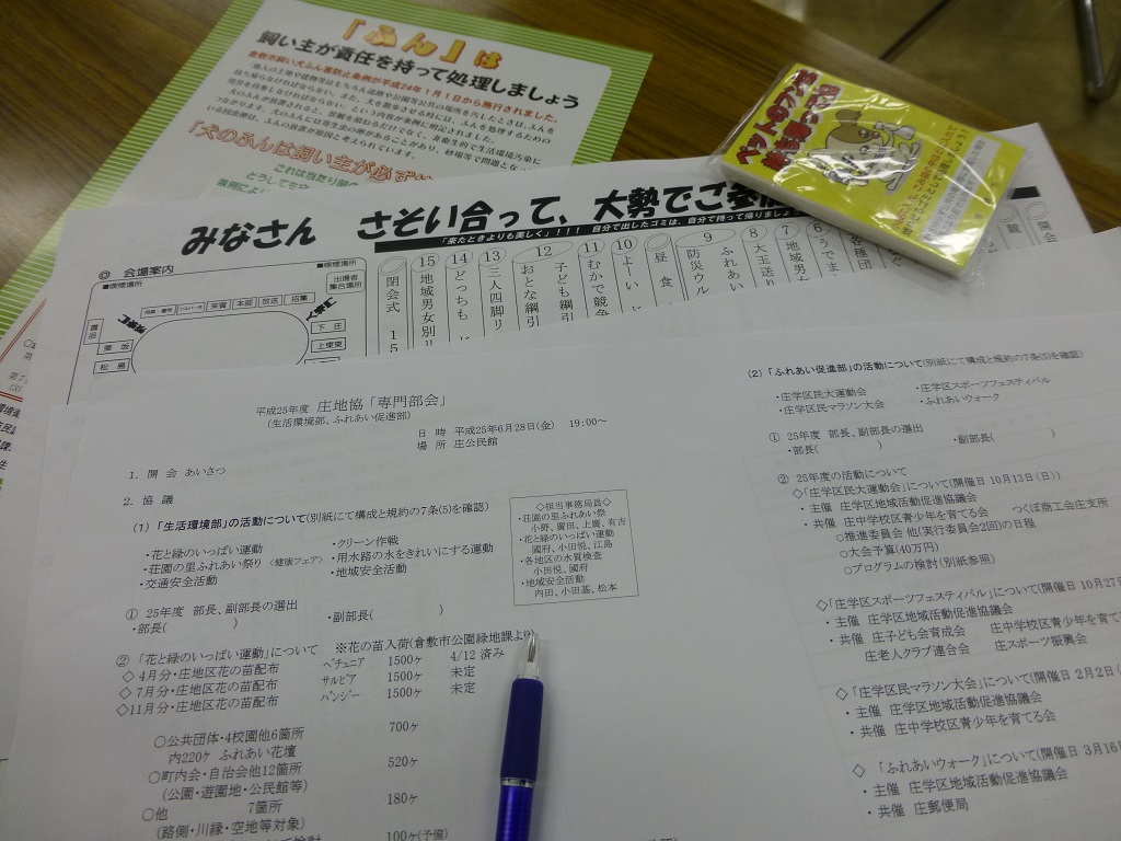 後ろのカラーの資料とティッシュは、庄の環境衛生協議会の方