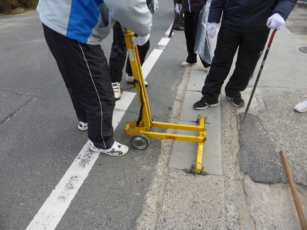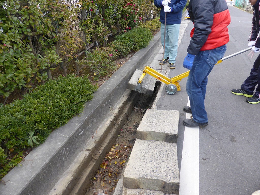 ここから、側溝の中の土砂をすくい上げての清掃が始まります