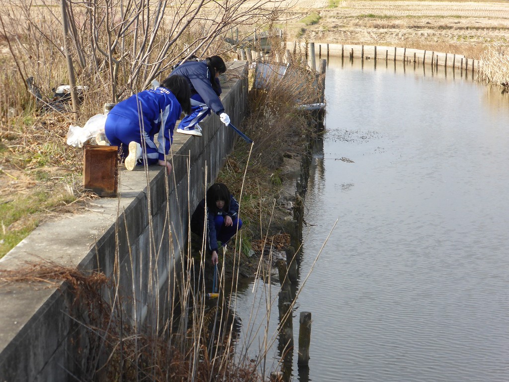 女子生徒、果敢にも川の近くまで降りてのゴミ拾いです