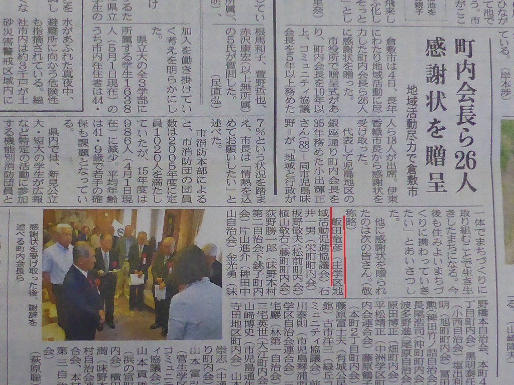 倉敷市が4日、長年に渡り地域活動に尽力された