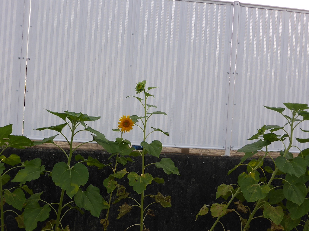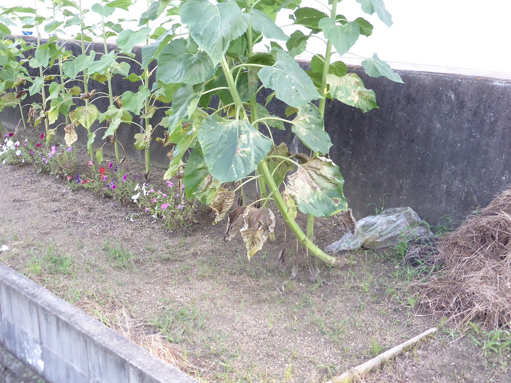 例の一番大きなひまわりが、いびつに倒れそう・・・